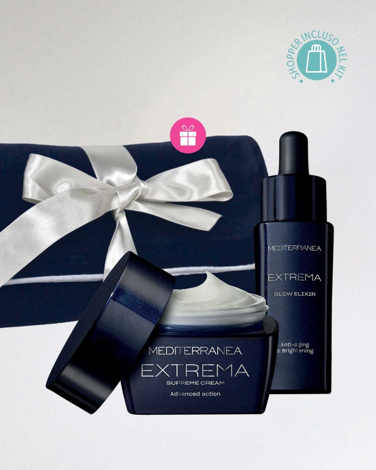 The perfect synergy of Extrema Supreme Cream and Glow Elixir to ensure the skin a complete treatment with a global anti-aging action. Seven beauty benefits concentrated in a few simple steps: hydration, reduction of wrinkles and fine lines, increased skin elasticity, improved tone, plumping, tightening, and even skin texture. Glow Elixir is a complete facial serum to combat all signs of aging, such as wrinkles, discoloration, loss of tone, and dehydration. Rich in pearls, it provides instant luminosity, leaving skin radiant. Supreme Cream is the ultimate anti-aging treatment, suitable for daily use day and night or as an intensive booster during seasonal changes. A complimentary velvet jewelry box to hold your most precious items is included. Including a shopping bag to wrap your gift.