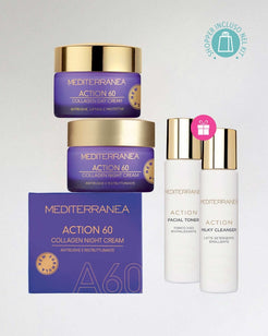 Una crema viso giorno dalla formula ricca di ingredienti innovativi dall'azione antirughe, lifting e protettiva. Grazie alla loro preziosa sinergia aiutano a rallentare l'invecchiamento cellulare profondo stimolando la sintesi di collagene ed elastina, ridefinendo i tratti del viso e migliorando la struttura cutanea. Una crema viso notte antirughe e ristrutturante che ottimizza il naturale processo di riparazione notturna della pelle. I suoi ingredienti attivi di stimolano la sintesi di collagene ed elastina, combattendo il rilassamento cutaneo e attenuando la visibilità delle rughe e proteggono le cellule da danno ossidativo. Le tue alleate di bellezza che ti accompagnano durante tutta la giornata, giorno dopo giorno, la pelle sarà come nutrita dall'interno. In omaggio il kit di minitaglie per la detersione Action (latte detergente e tonico). Incluso lo shopper per confezionare il tuo regalo.