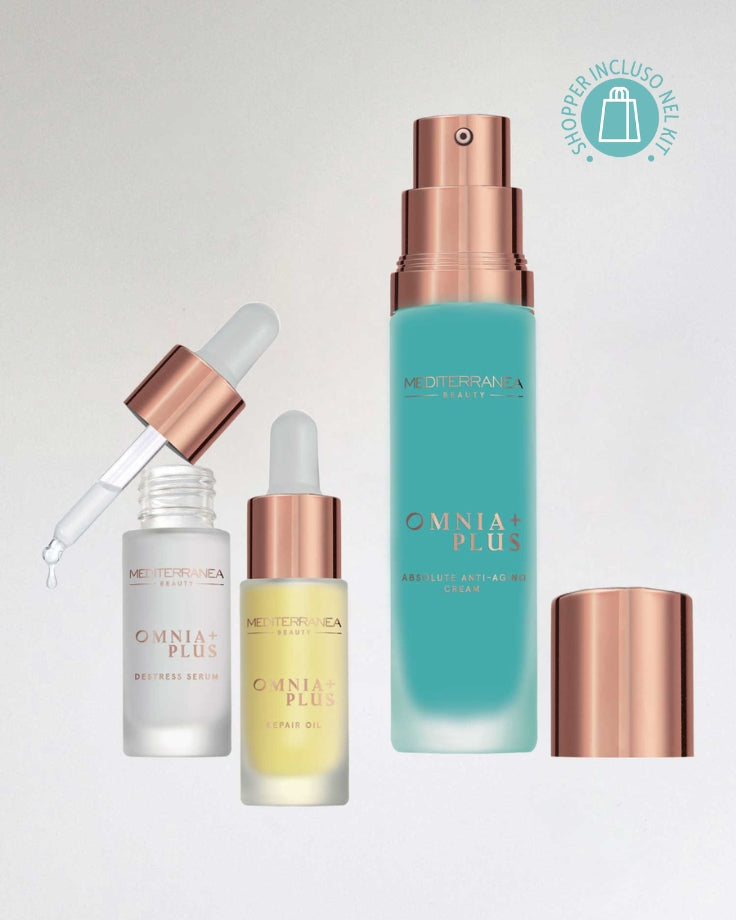 Linea Omnia plus è una linea premium nei trattamenti di bellezza antiaging. Skin essence duo è un trattamento urto innovativo costituito da un siero viso "anti-stress" e un olio viso "riparatore" da miscelare assieme per ottenere un'emulsione che stravolgerà la tua pelle rendendola subito più liscia, morbida e levigata. Da abbinare a questo trattamento urto Omnia plus Absolute anti-aging cream, un trattamento all over, viso e contorno occhi, ricco di ingredienti attivi per rendere la pelle più uniforme, compatta, distesa e luminosa.