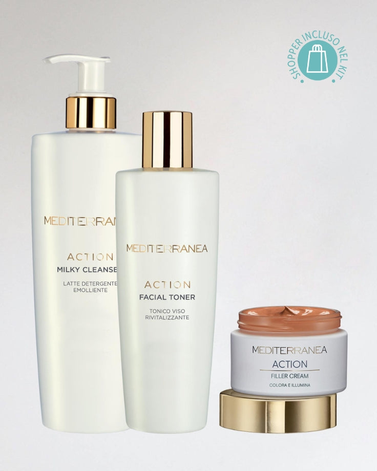 Un kit di trattamento per il viso che regala nuova luce e radiosità in poche semplici applicazioni. Inizia con la detersione, mattino e sera, è il primo passo per una beauty routine efficace. Action Milky Cleanser, un latte detergente emolliente dalla texture fluida ma ricca che rimuove impurità lasciando la pelle morbida e vellutata. Subito dopo applica Action Facial Toner, una lozione tonificante che rimuove i residui del latte detergente lasciando la pelle rivitalizzata. Grazie alla presenza di estratti glicolici di fiori e frutta e acido glicolico assicura una microesfoliazione delicata uniformando l'incarnato. Action Filler cream è una crema viso colorata dalla doppia azione, da un lato idrata la pelle levigando le linee sottili, dall'altro dona un tocco di colore naturale e trasparente illuminando il viso. Dona un effetto bonne-mine alla pelle e uniforma la carnagione, lasciando trasparire la tua bellezza. Incluso lo shopper per confezionare il tuo regalo.